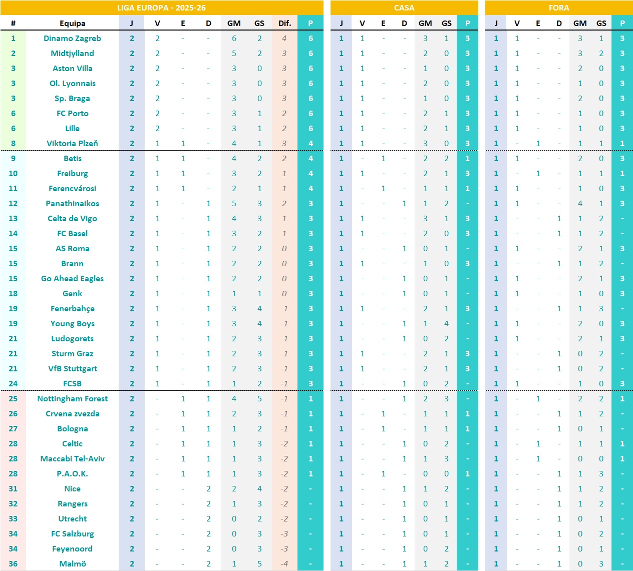 Liga Europa – 2025-26 – 2ª Jornada – Resultados e Classificação