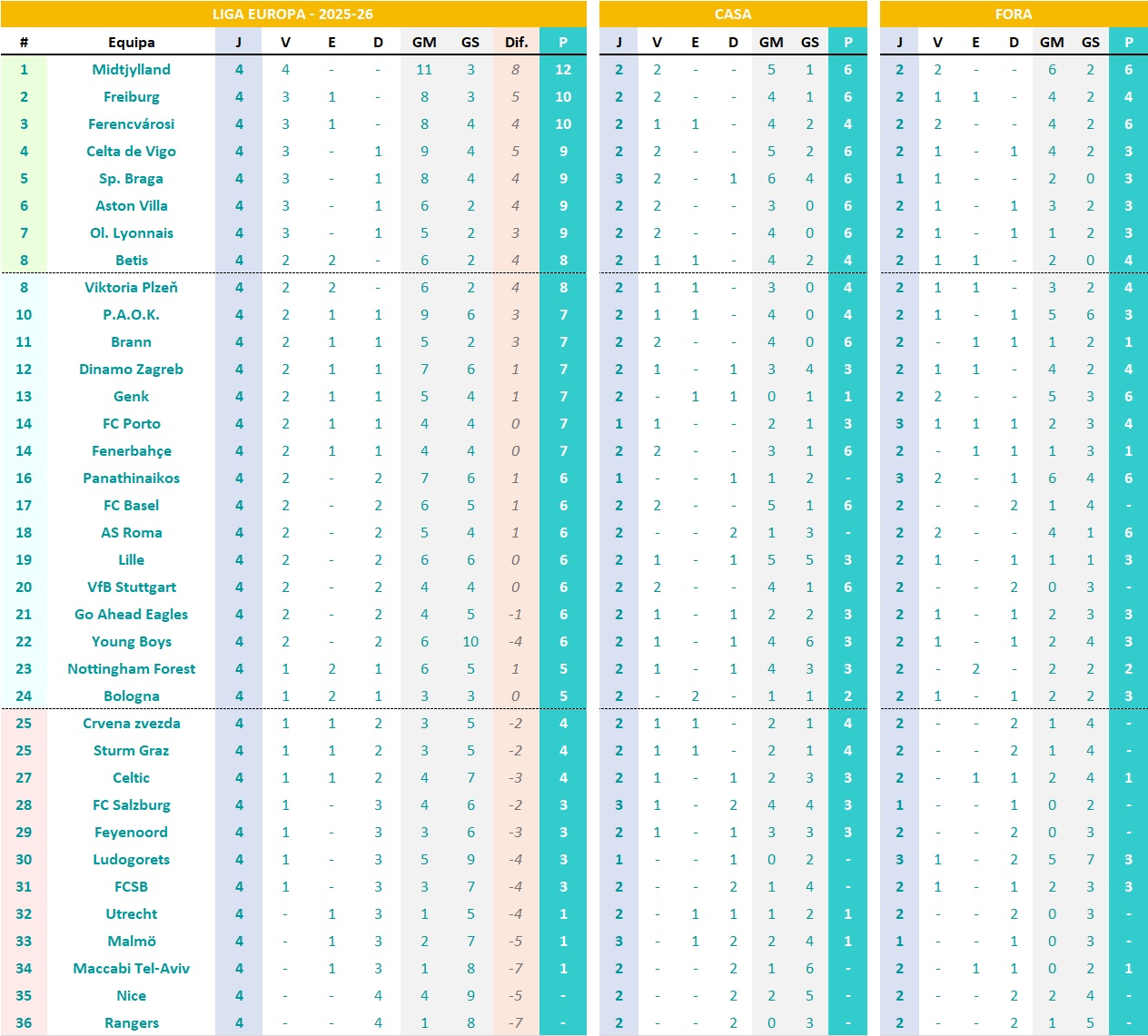 Liga Europa – 2025-26 – 4ª Jornada – Resultados e Classificação