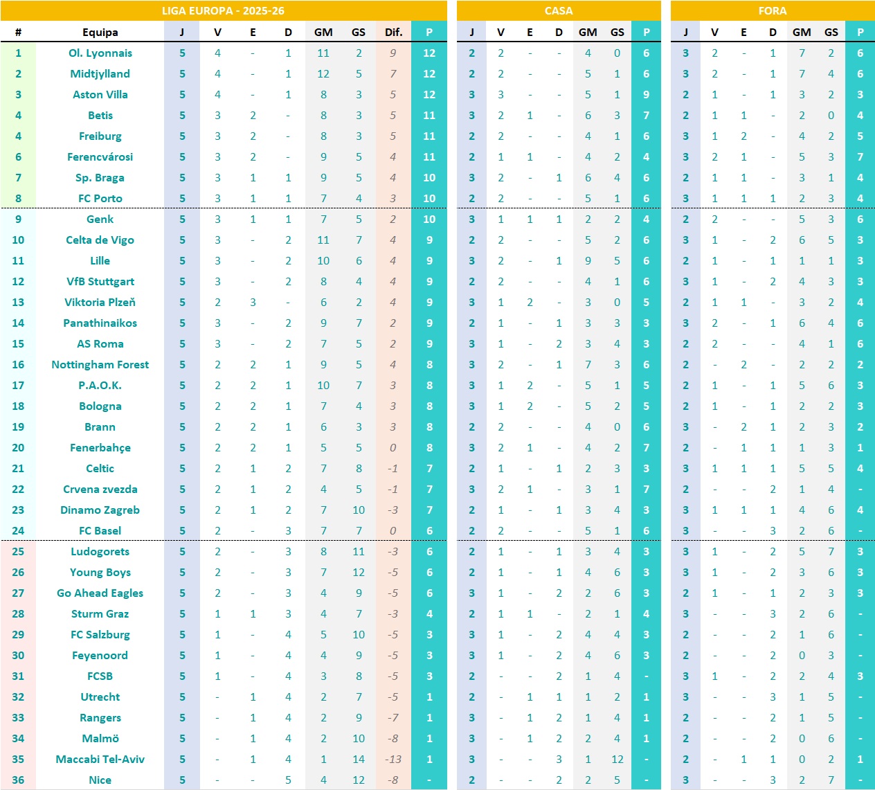 Liga Europa – 2025-26 – 5ª Jornada – Resultados e Classificação