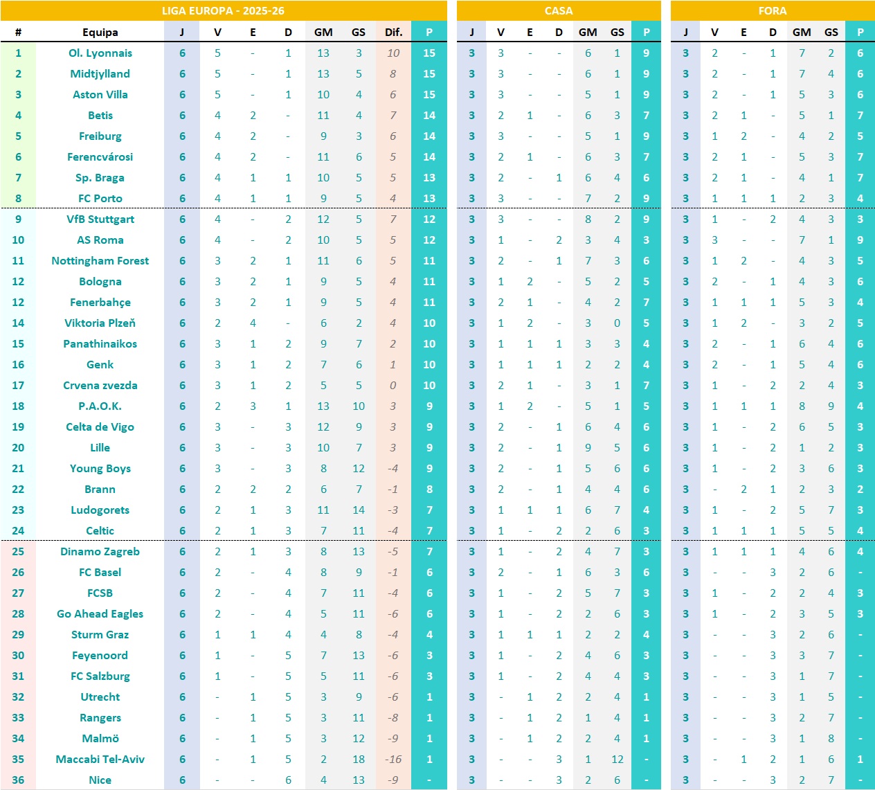 Liga Europa – 2025-26 – 6ª Jornada – Resultados e Classificação