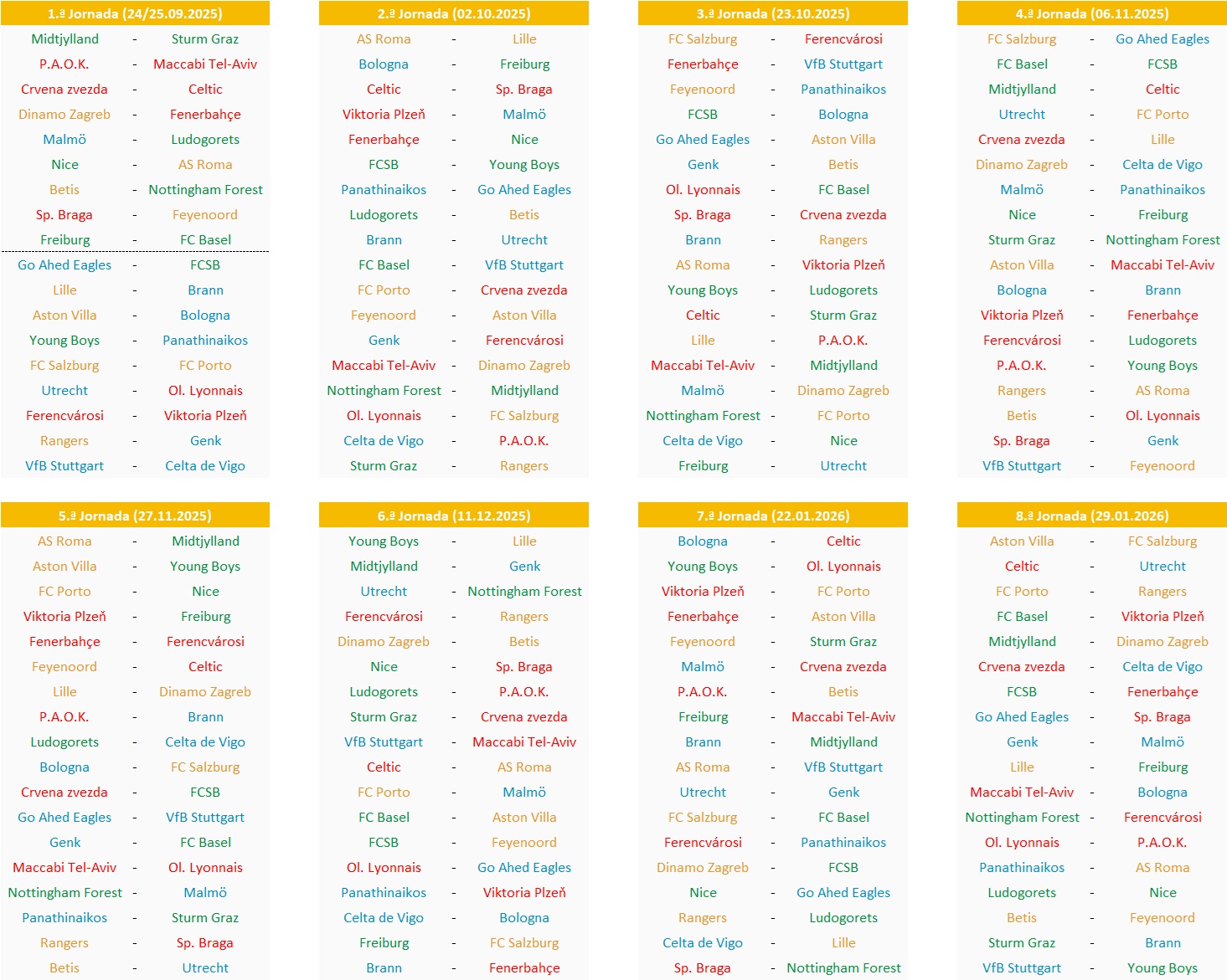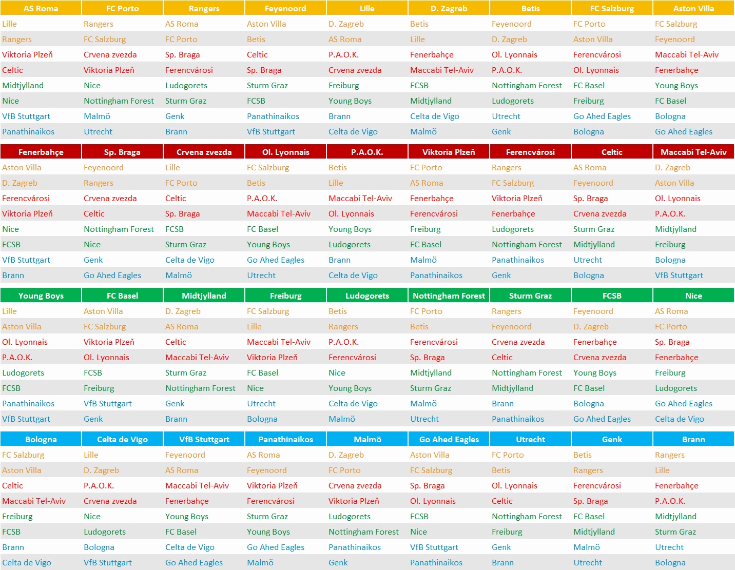Também na segunda temporada neste novo formato, numa “Liga” disputada em oito rondas, com cada clube a defrontar dois adversários de cada um dos “Potes” 1 a 4, é o seguinte o sorteio da “Europa League” 2025-26, i, indicando-se a sombreado, para cada equipa, os jogos a disputar fora de casa: