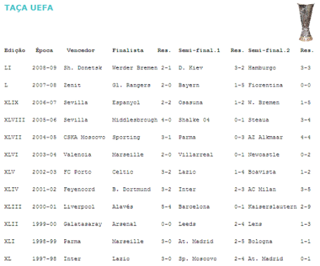 Com a realização da 51ª Final da competição, hoje disputada em Istambul, entre Werder Bremen e Shakhtar Donetsk, com vitória da equipa ucraniana, por 2-1, no prolongamento, conclui-se a existência da Taça UEFA (precedida, até 1970-71, pela denominada Taça das Cidades com Feiras), a partir da próxima época substituída pela nova “Liga Europa”.