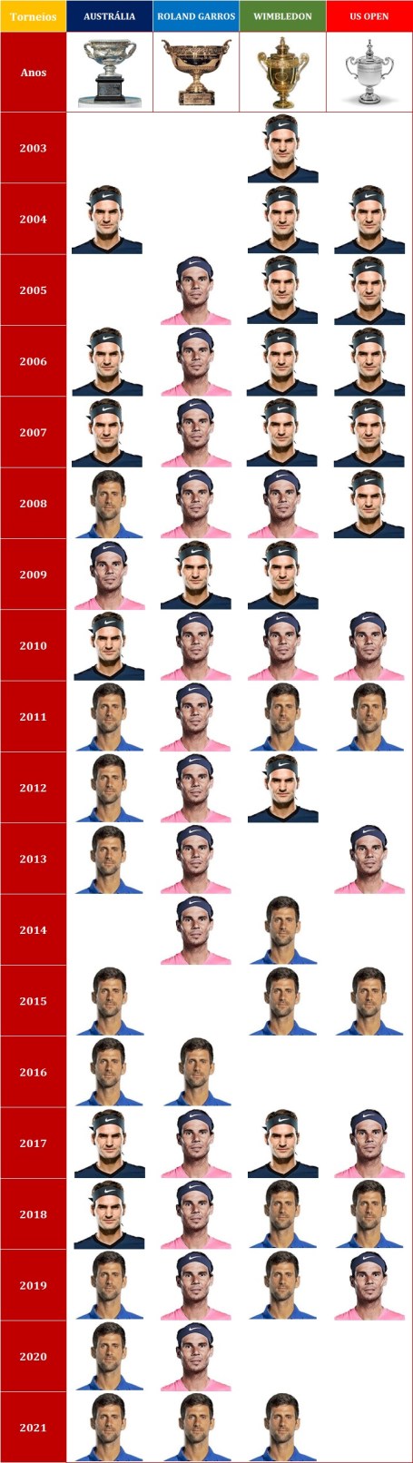 É a seguinte a lista de resultados das 21 Finais de Torneios do Grand Slam ganhas por Nadal: