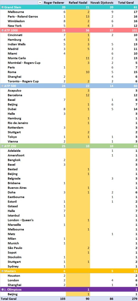 (ver quadro completo de (270) títulos ATP conquistados por Roger Federer, Rafael Nadal e Novak Djokovic)