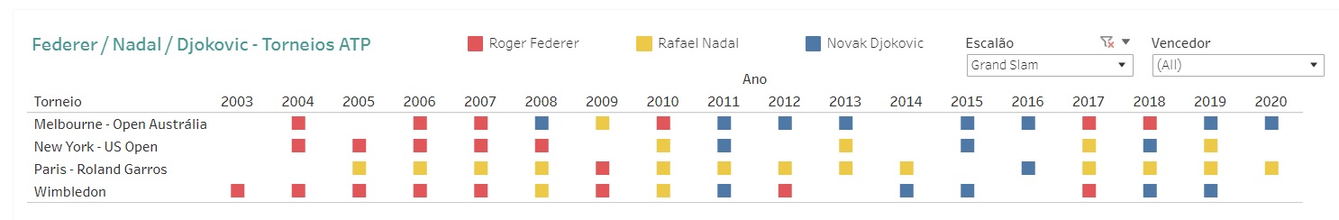 Clicar na imagem para aceder ao grafismo interactivo, no qual podem consultar-se todos os titulos conquistados por Roger Federer, Rafael Nadal e Novak Djokovic, filtrando por torneio, por escalão e por ano.