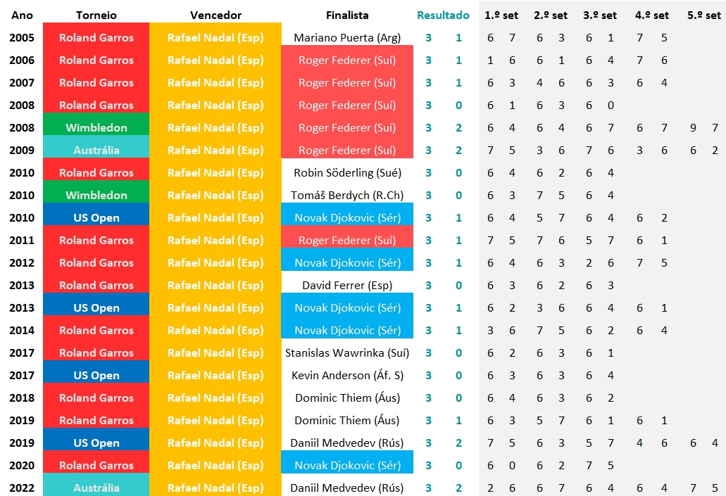 É a seguinte a lista de resultados das 21 Finais de Torneios do Grand Slam ganhas por Nadal: